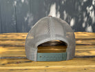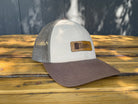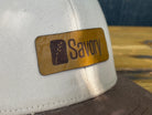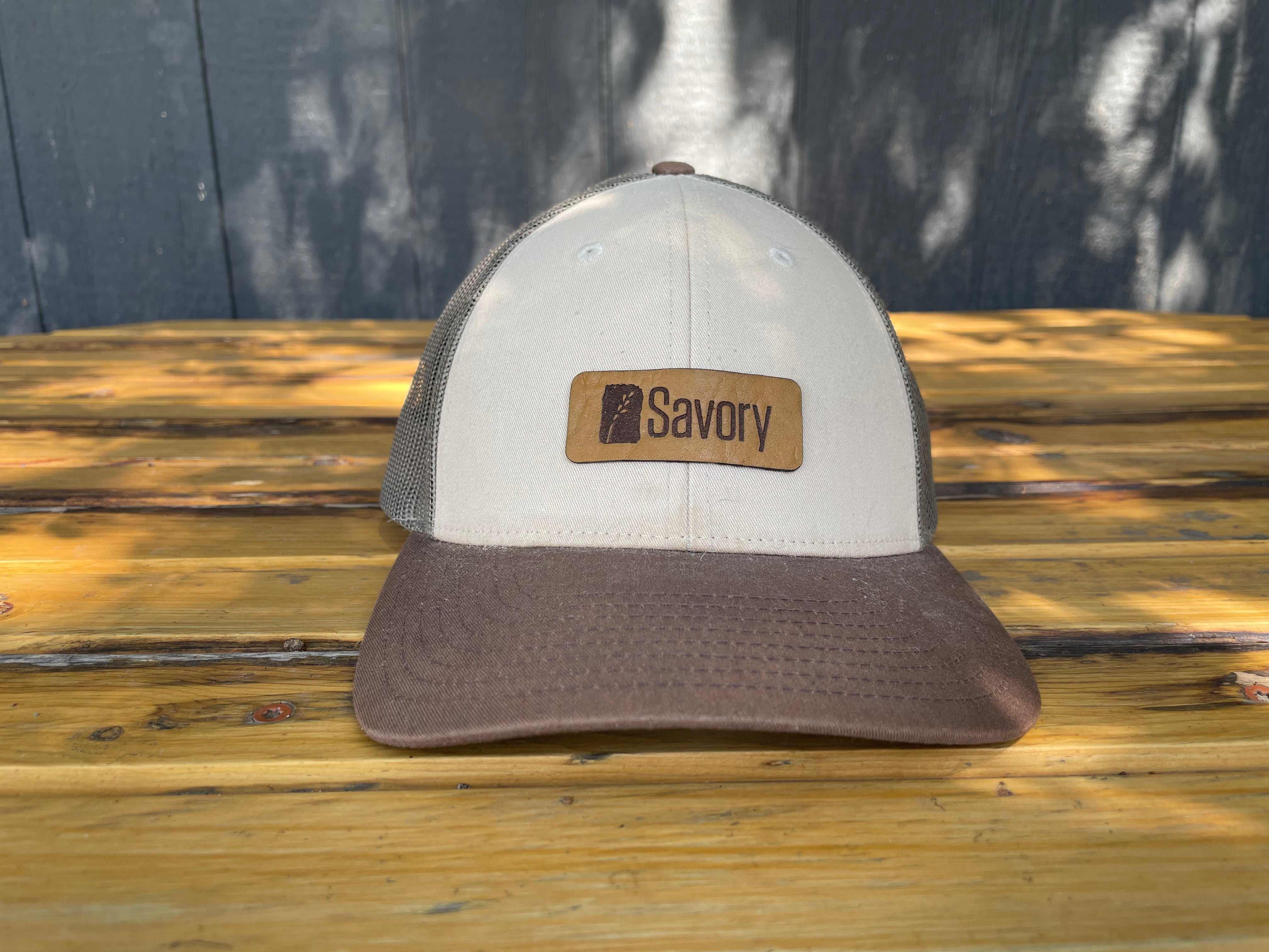 Classic mesh-back low profile trucker cap with light tan front panel, dark tan visor, and grey mesh back featuring a leather Savory logo patch with leather from Savory Hub White Oak Pastures.